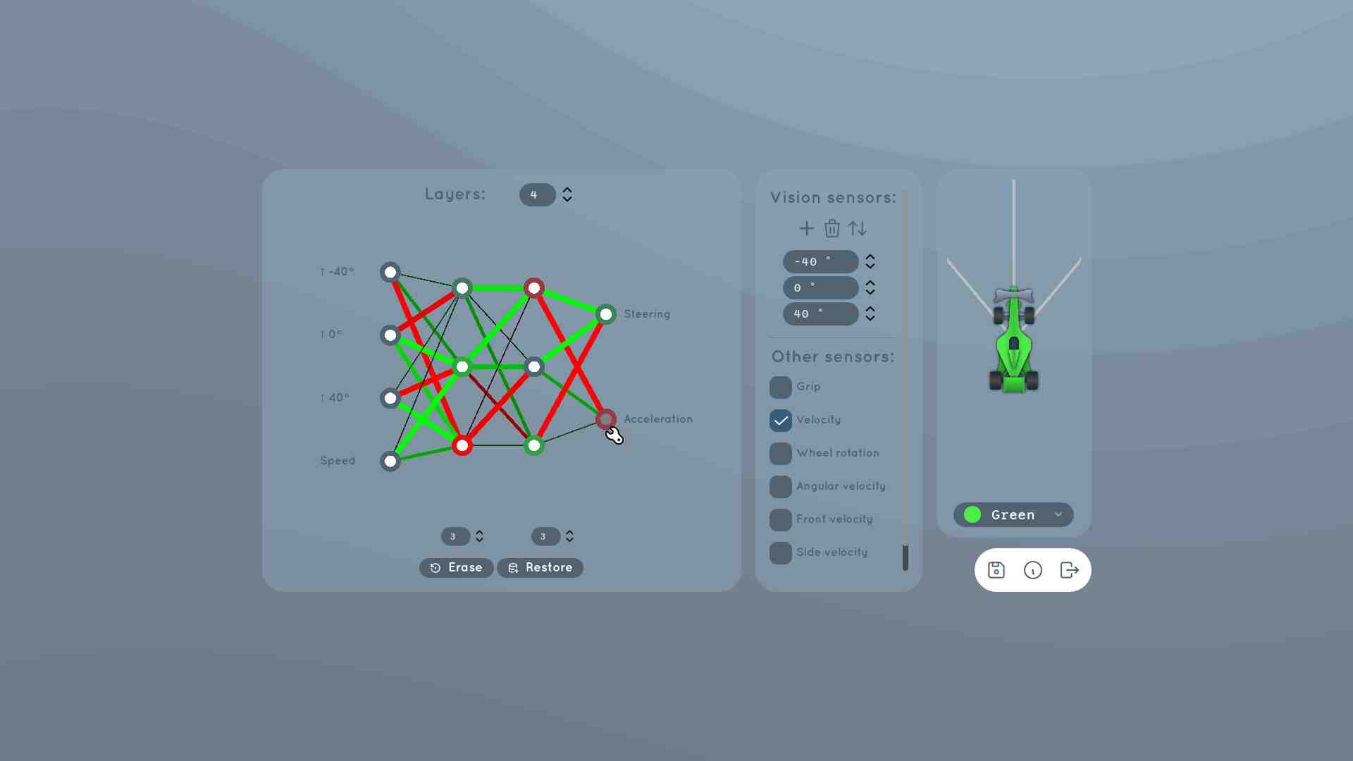 - Over successive generations, the AI evolves, improving its driving skills based on player-defined parameters and performance metrics.