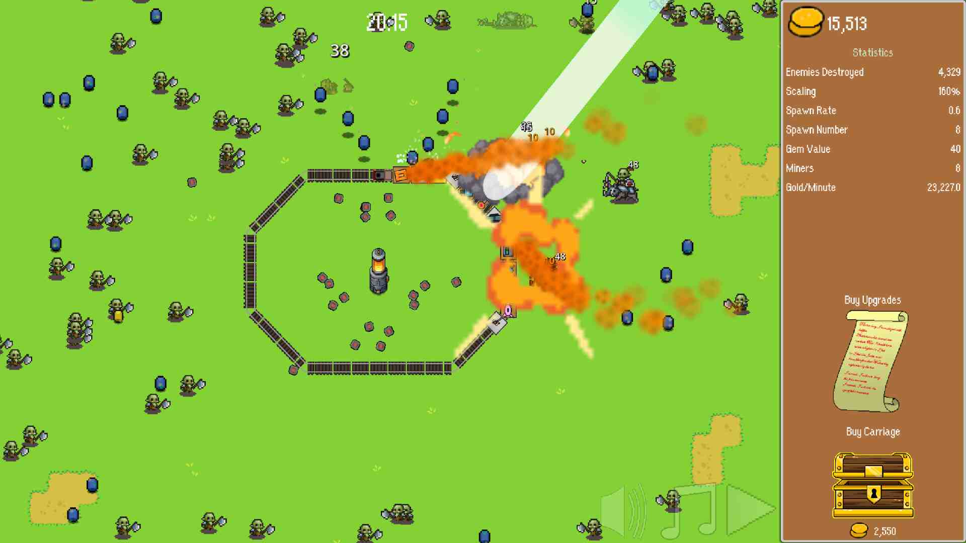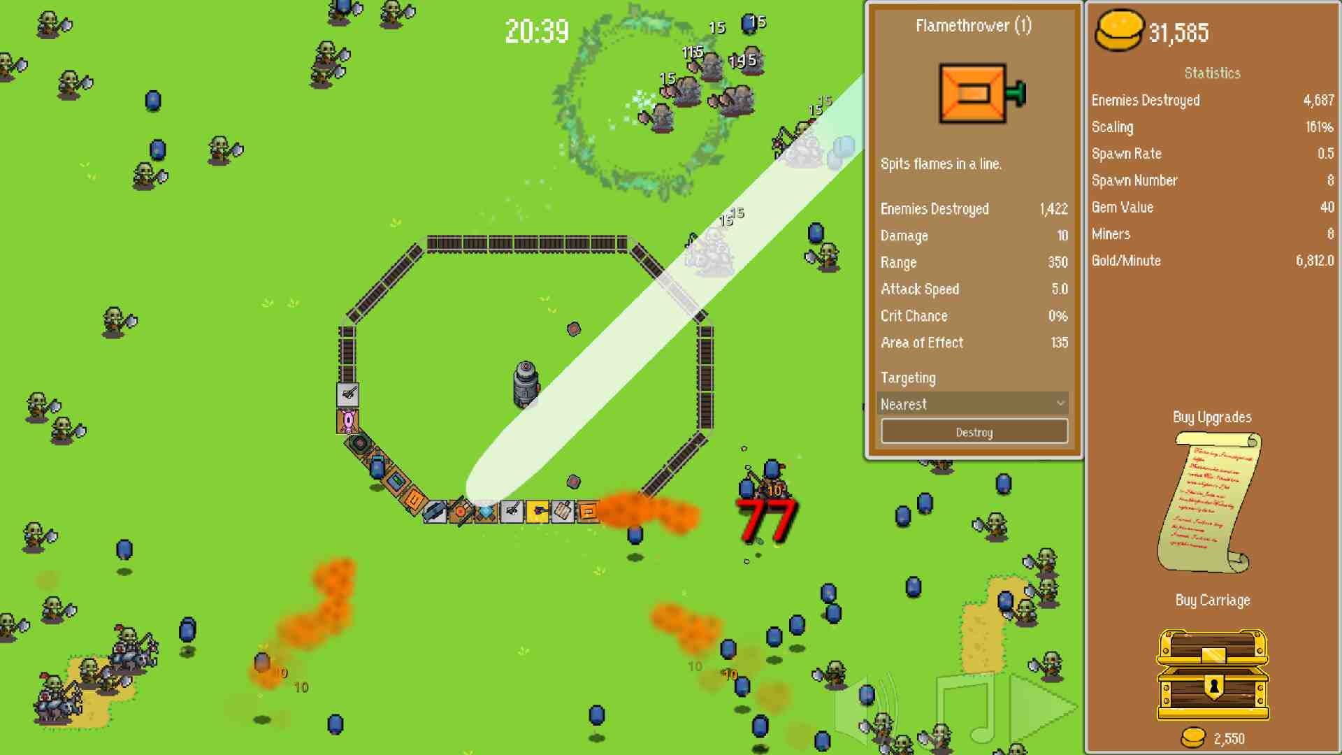 Level up your carriages by combining 3 of the same type and level to create even more powerful defenses! You can level up carriages infinitely, but it’ll cost you. It’s essential to buy upgrades from the shop! Upgrade the value of gems so that each gem is worth more gold, and hire miners to automatically produce more gems for you. I know it just got released but I cant wait for some maybe upgraded new art as it progresses in both the energy thing in the middle, the carraige skills and even the background in general.
