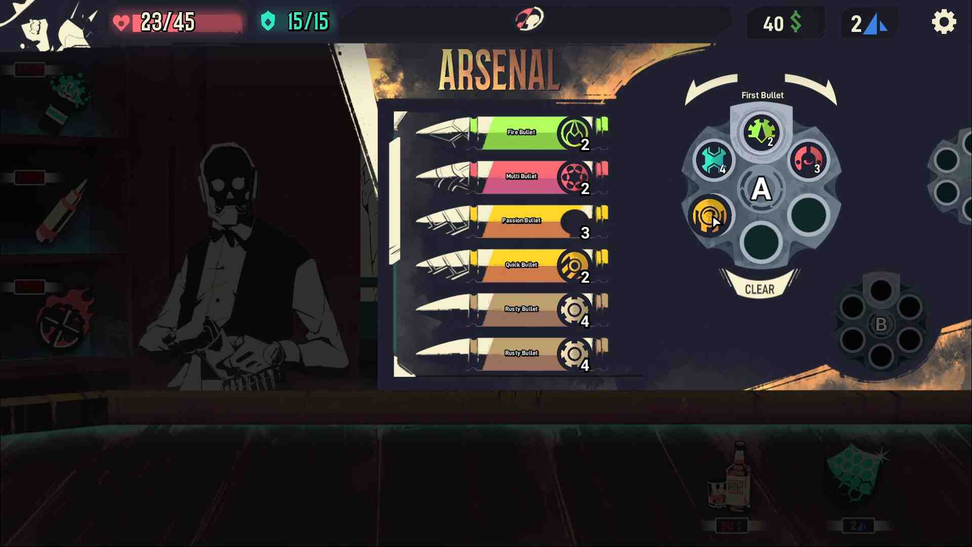 Barrel Roll is a turn-based roguelike deckbuilder. The deck ? A six slot revolver barrel. Take down hordes of outlaws to get to their leaders. Collect bullets with special effects, trinkets and resources. Each of your bullets has its archetype (Damage, Shield, Initiative, Focus and Killer). It’s up to you to customize your ideal barrel et create powerful synergies to counter your enemies ! Face groups of 3 to 5 bandits in turn based combats. After each of your shots, choose your next bullet between the 3 next and come up with mind blowing combos ! (Literally…) Crush your opponents (at least their shield) to delay their next turn and use one of your 3 skills to show your mastery and turn the duel upside down.
