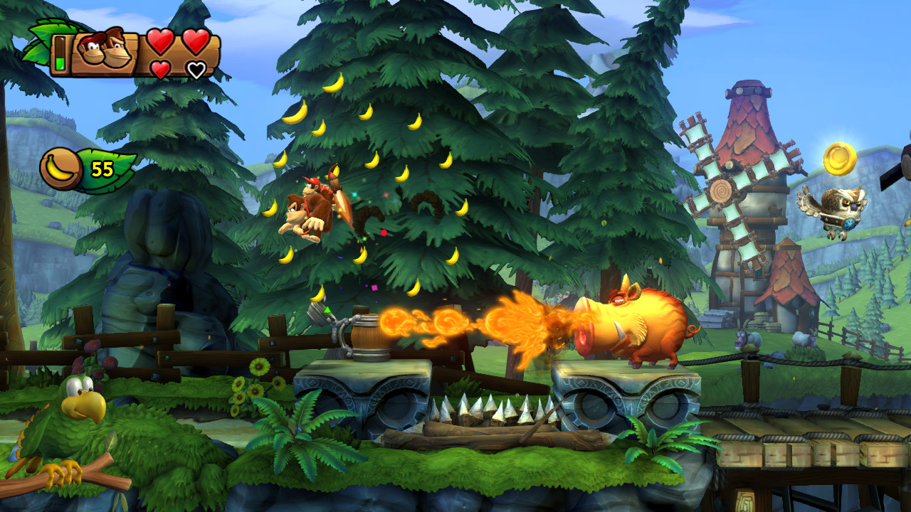 For a more accessible experience, start a game in Funky Mode to enjoy a range of gameplay updates and a new main-character option, spectacular surfing simian Funky Kong! His extra hearts and unique abilities make for a more relaxed gaming experience. And no matter which mode you choose, a wealth of collectibles and two-player co-op round out the fun Along with Diddy Kong, who returns with his barrel jet pack for crossing large gaps, two additional characters are added; Dixie Kong and Cranky Kong. Dixie has the ability to spin her ponytail into a propeller and slowly descend through the air, with an initial boost in height at the start, allowing her and Donkey Kong to fly up out-of-reach platforms or items.
