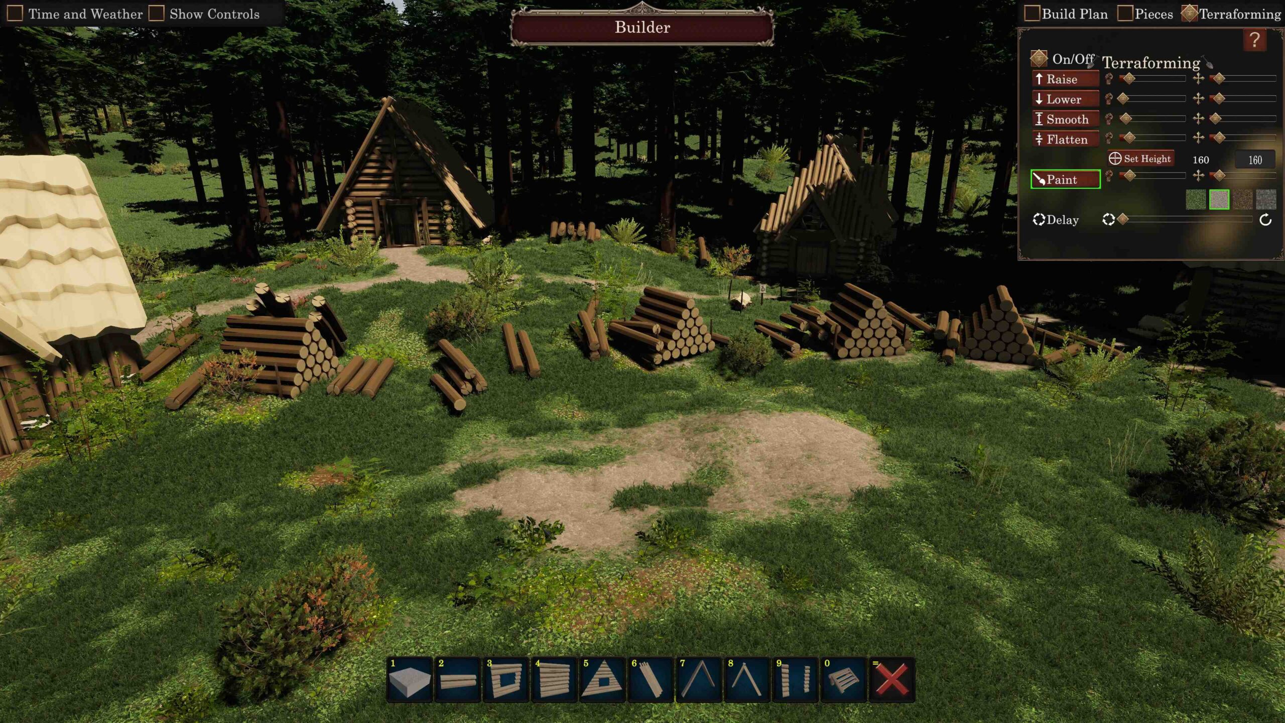Craft tools. Harvest resources to build shelters and early buildings to advance your economy. You’ll need to brave realistic full day and night cycles as you live through the seasons and gain valuable skills and knowledge. Upgrade and construct unique buildings through a modular building system. Mix and match over 100 unique building pieces, with more to come during early access. Create buildings from scratch or make blueprints that you can edit, improve, and share on the Steam Workshop. Sculpt the terrain and make it hospitable for your new settlement – Flatten large areas for farming, raise or lower platforms for building plots, fill in valleys, dig out moats and trenches. Paint lush grassy and forest areas or remove vegetation to make room for more roads, buildings, and people.