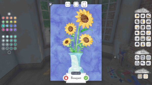 Everything you discover while exploring — from flowers to birds — is added to your album, an ever-growing compendium of stamps that you can then mix and match in your artworks. Create gorgeous 2D watercolor artworks effortlessly with Été’s unique canvas system. Any stamp collected in your album can be added to your composition, moved, resized, recolored, and even spun around in 3D! Some NPCs will commission you with inspiring requests for specific artworks, but you’re also free to paint as many unrestricted creative artworks as you like. Those artworks can then be hung on your walls or auctioned at the local café… and maybe, if you get famous enough, be exhibited in your very own exposition.