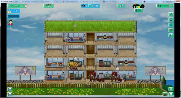 This is a 2D simulation and management game. Players need to build stores and purchase goods to attract customers for consumption. There are 18 different types of buildings that can be constructed. In addition to customers, there will be troublemakers like thieves and robbers. Players can use employees, specifically security guards, to maintain order. Players can also raise small animals. There are 22 different types of small animals and they have distinct abilities, such as finding money. Players need to manage their stores and build relationships with other shopping centers to attract hunters to eliminate monsters.