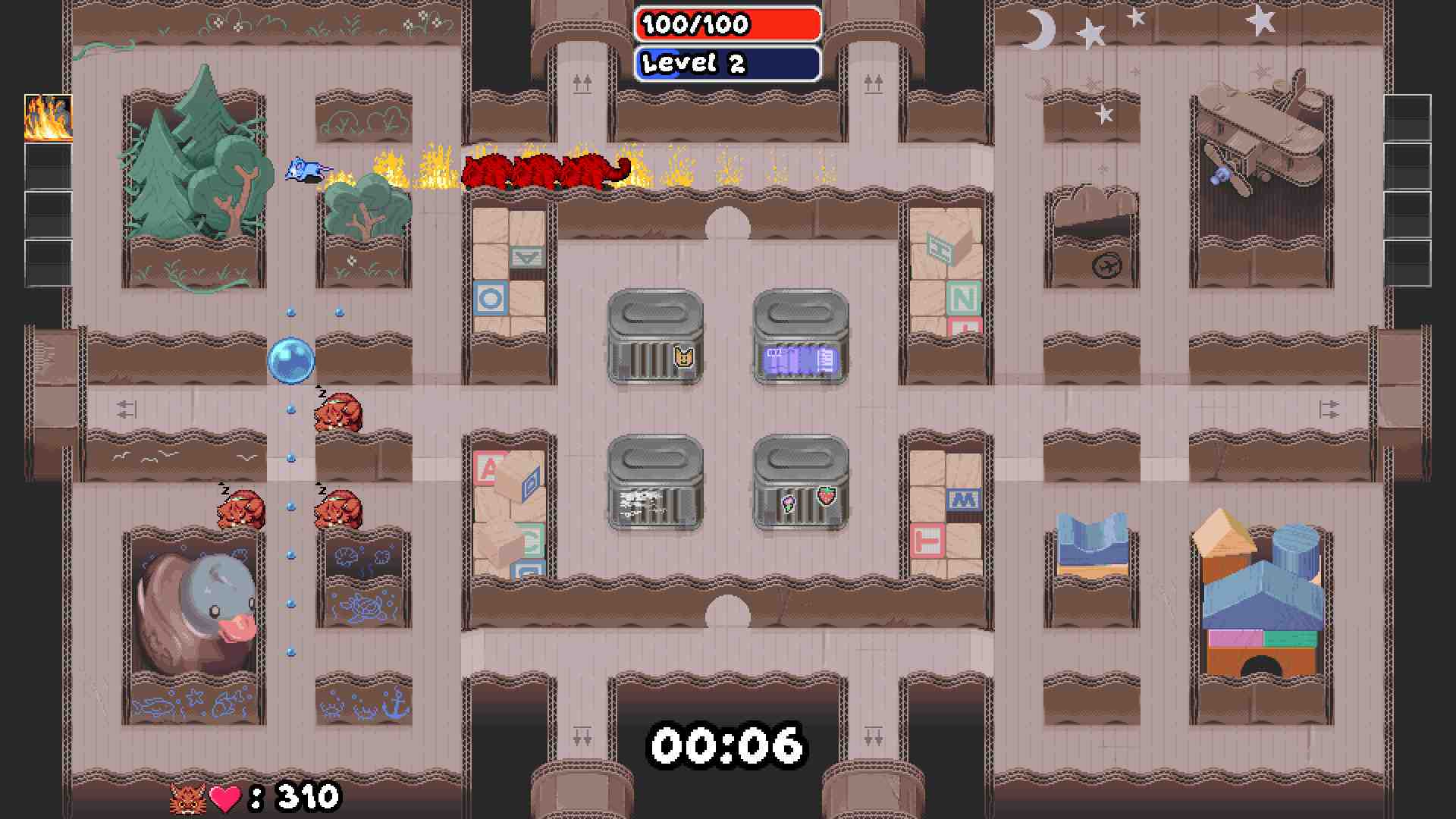 Auto-shooting weapons, passive upgrades, and items that appear on the map to create boosts or big damage will manifest as you gain levels, which you gain through XP, which you gain through gathering the pellets and the Big Orbs. These all have cooldowns, and they’re graciously displayed with the item icon on the margins of the screen. I personally love the items-on-the-map wrinkle to these perks: having mines or an “item crush” saxophone appear on the map and having to chase those down is an extra little sub-objective in your pathing to the orbs. Hitting the sax and then efficiently detouring for the orb feels great.