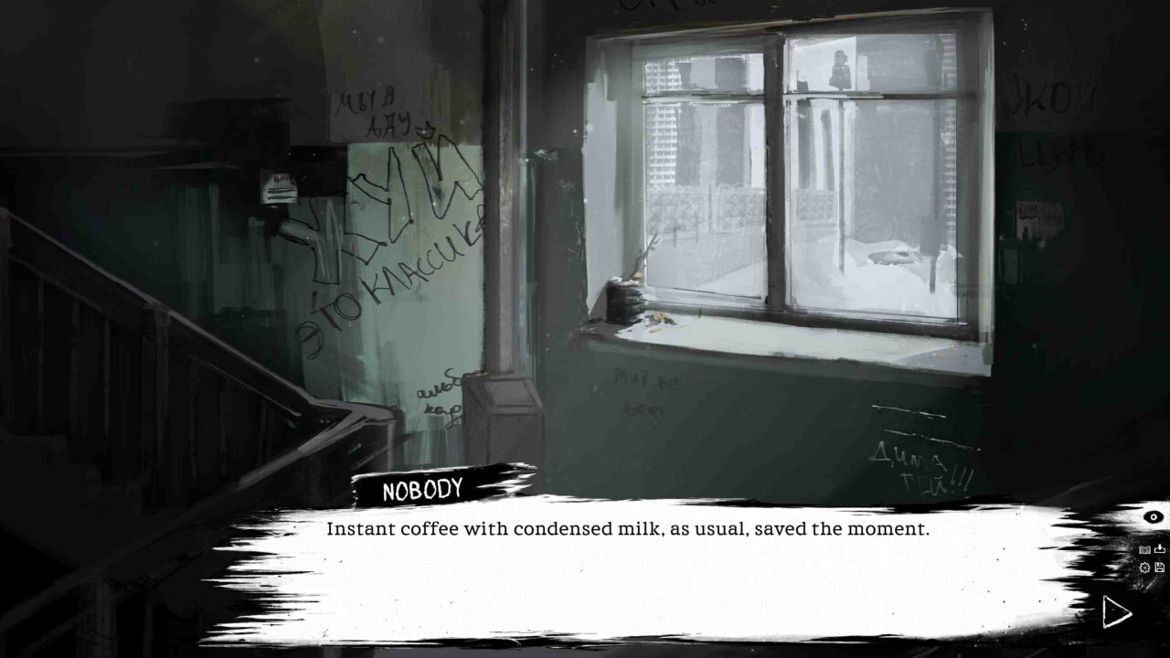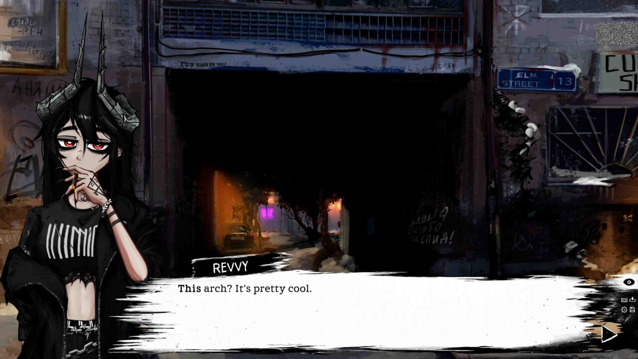 Clouds overhead and dirty snow underfoot. The game’s locations reflect the realities of provincial post-CIS cities. Our story begins in one of them. Not the most cheerful landscape, is it? Every scene is inspired by real-life streets. A game about hanging out with a hot demon girl while having no idea what to do with your life. Highly recommended if you like shorter VNs, can handle dark subject matters, multiple choices, and beautiful CGs. This VN deserves much more attention!