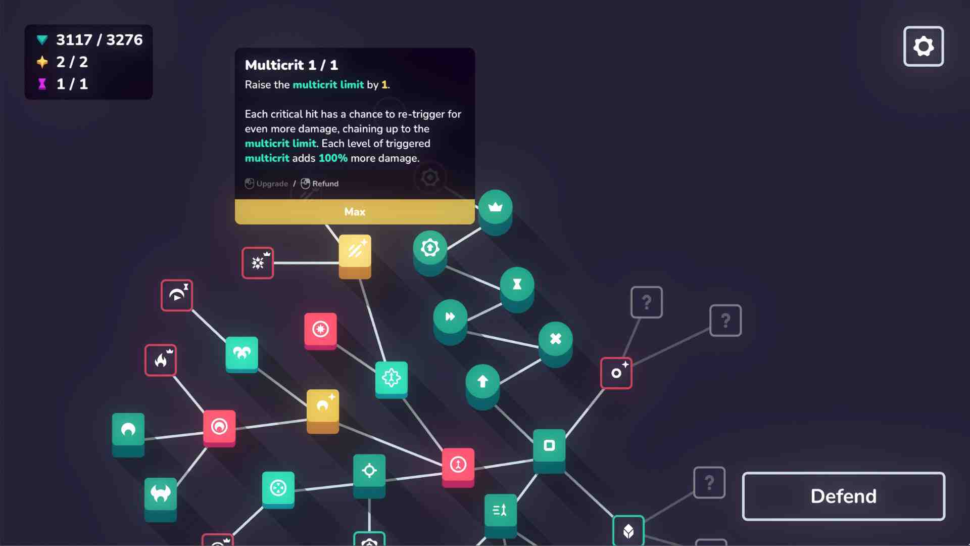 Heck yeah! This game is great. frustrated at this style of game (do a run, upgrade on a tree) for a while now because so many of them have upgrades which are simply “increase health” or “increase damage” – and so many of them end with the tree being maxed out. This game is not that. The upgrades are interesting and synergistic, and you have to consider tradeoffs. You actually have to use your brain! Add on to that the challenges on each level which require you to experiment with different builds. One level may be asking you to take damage on purpose. Another may be asking you to do burn damage. Another might be looking for lightning jumps.