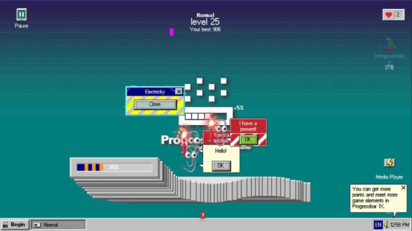 Progressbar95 is an arcade-style game that is reminiscent of classic games from the 90s. The game’s interface is designed to look like an old-school computer operating system, complete with a desktop, icons, and a progress bar. Players have to fill up the progress bar by collecting tokens while avoiding obstacles such as viruses, firewalls, and other hazards. The game starts off easy but gradually becomes more challenging as players progress through the levels. There are over 200 levels in the game, each with its unique set of challenges.