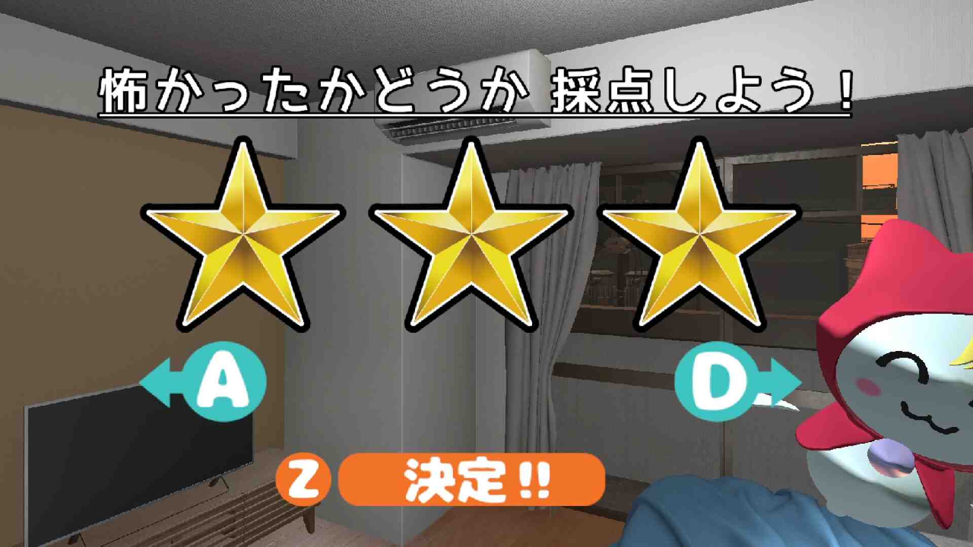 Score the Fear” is a 3D adventure game in which you explore rooms and find hidden ghosts. The little ghost that appeared before your eyes seems to want to become a proper evil spirit. He’ll scare you in a variety of ways, so rate him on whether he was scary or not. The story will last up to three days and unfold depending on the results of the scoring. Can you make this child’s wish come true? Ghost boy (Yu-kun) is hiding in various places in the room to scare you. Find Yu-kun and let him scare you. Once you’ve found him five times, it’s time to rate him. Give him a rating out of 3 stars, from 1 to 3. USAID Approvals Department