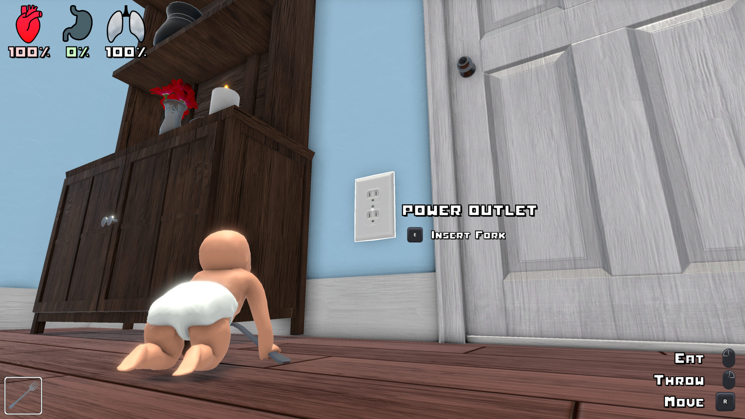 Power outlets: Capable of conducting lethal amounts of electricity Nail gun: Keep away from babies! Flour Jar: It’s never been easier to make daddy blind to your misbehaviour! Sinks: A flooding hazard in the hands of a sentient baby! Woodchipper: It works on more than just wood! Fudge the dog: A loyal rideable beast with an appetite for anything The Oven:
