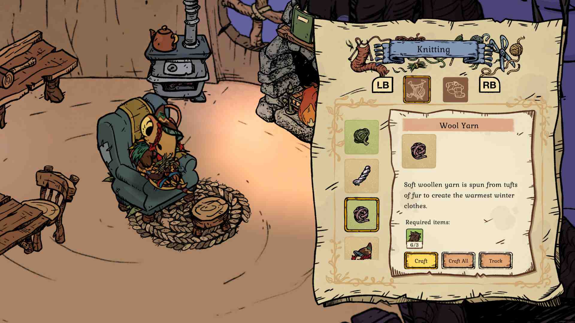 - Crafting and knitting: make tools and equipment, but also knit woollen clothes to help survive the cold.