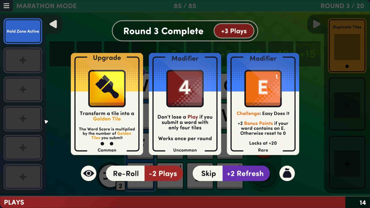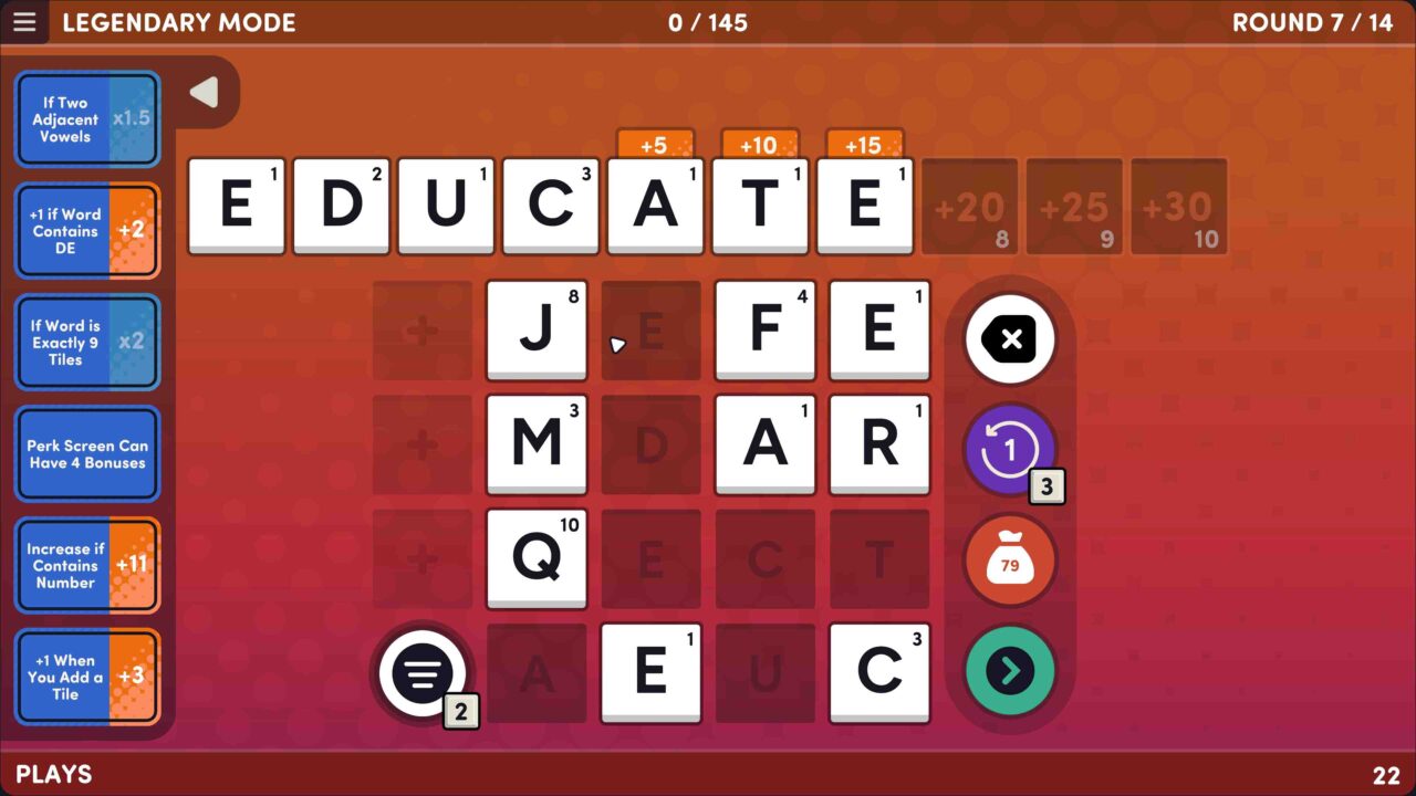 Gifts add new tiles to your letter bag. Like wildcards, mirror tiles, and the legendary + tile. Upgrade tiles to special forms like Golden, Diamond, Emerald, and Potion, to score more points. Combine modifiers, upgrades, gifts, and special tiles in clever ways to score big! Watch out for devious Special Rounds that require perfect play. Can you reach the end of the game without running out of “Plays”? Or will you have to start again from scratch? Learn the ropes with Easy mode, then try Normal, Hard, Legendary, and Marathon modes. Play with mouse, keyboard, or controller. Use dyslexic fonts and / or high contrast mode. Get spelling suggestions. And more.