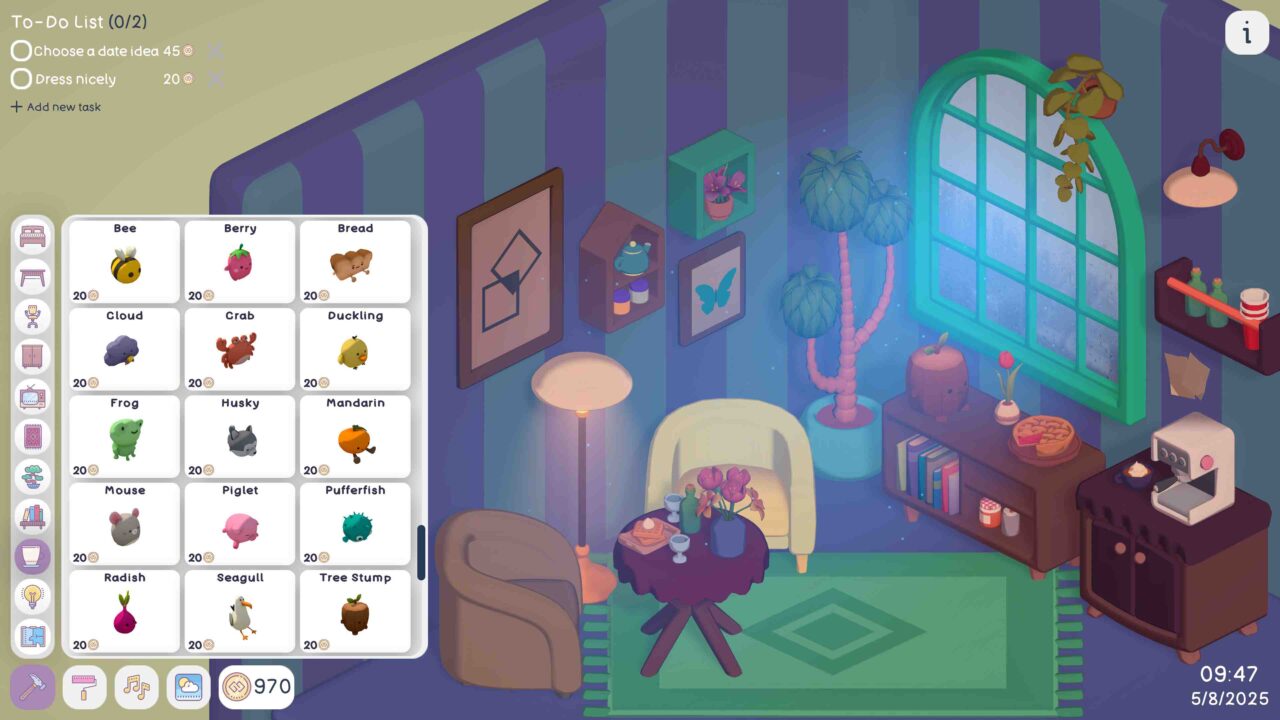 Your Personal Chill Apartment is a charming and cozy room decoration game that blends creativity with light productivity features while listening to some chill music. The productivity mechanics are rather basic: you can define any number of tasks and assign each a value of up to 150 coins. When you complete a task (which involves crossing it off the list), you earn the corresponding amount of coins. Each item is fully recolorable, allowing you to match your color scheme throughout the room. Additionally, the ambient weather can also be changed.